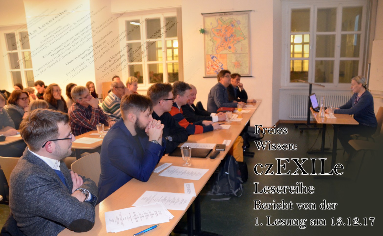 Zur Eröffnung habe ich in den Hintergrund der Veranstaltung eingeführt. Alles began 2015, als sich Prof. Dr. Roland Meyer (Westslawische Sprachen, HU), Dr. Bertram Nickolay (Fraunhofer IPK) und Stefan Butt (Archiv im Böhmischen Dorf) beim Netzwerktreffen der Tschechien- und Tschechisch-Akteure Berlins traffen. Die Veranstaltung wurde im Rahmen des 20. Jubiläums der Städtepartnerschaft Berlin-Prag vom Roten Rathaus organisiert. Das Fachgebiet der Westslawischen Sprachen (Institut für Slawistik der HU) hat dadurch über die Rixdorfer Handschriften erfahren. 2016 wurde eine Projektidee entwickelt, ein internationales Workshop Czech in Exile durchgeführ und es began die Suche nach Finanzierungsmöglichkeiten. 2017 kam das Projekt unter die neun von über Hundert, die von der VolkswagenStiftung (Programm Mixed Methods) eine Zusage für die Förderung bekamen. Im gleichen Jahr gelang es dem Projekt durch die Förderung von Wikimedia Deutschland, Stifterverband und VolkswagenStiftung (Programm Freies Wissen) seine Öffnung für die Allgemeinheit zu verwirklichen. Die czEXILe Lesereihe wird nun bis Mai 2018 umgesetzt.